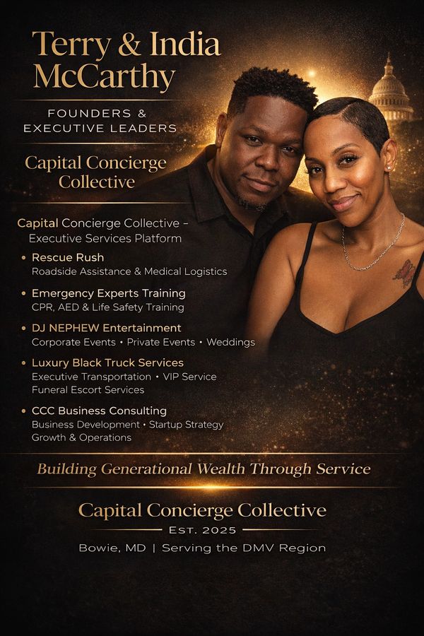 Our journey into entrepreneurship began when Terry was already operating a DJ entertainment business. India immediately helped elevate the brand, and that partnership sparked a passion that grew into multiple service-based ventures — including event services, catering, personal chef experiences, rentals, and now Capital Concierge Collective.